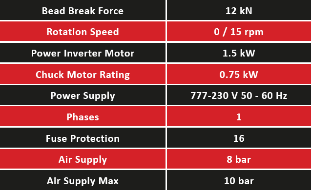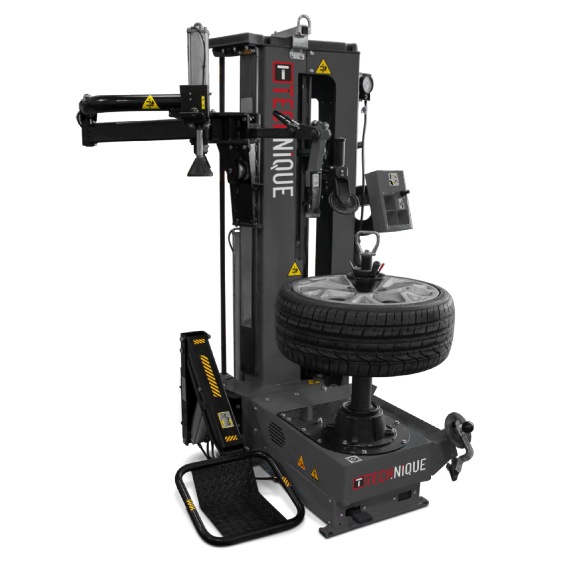 The Technique T2225-M2 tyre changer is equipped with an innovative leverless tool (patented) that allows to work quickly and effortlessly even on new-concept and ultra-low profile tires, RUN-FLAT. Complete with a double roller bead breaker pushing system, the tyre bead is breaked quickly and safely by two opposed and synchronised disks. The center post locking with floating plate (patented), suitable also for reverse rims, offers a self-locking mechanism that reduces the effort of the operator. The wheel rotation can be controlled as desired by the operator through the inverter motor with speed limiter to protect the tyre from excessive forces (0 – 15 rpm).